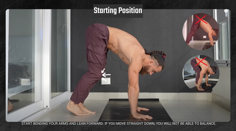 - Starting Position: Start bending your arms and lean forward. If you move straight down, you will not be able to balance. From here, move forward, bend your arms, and keep your elbows close to your body. Do not bend your arms too much because the more you bend, the harder it will be to push.