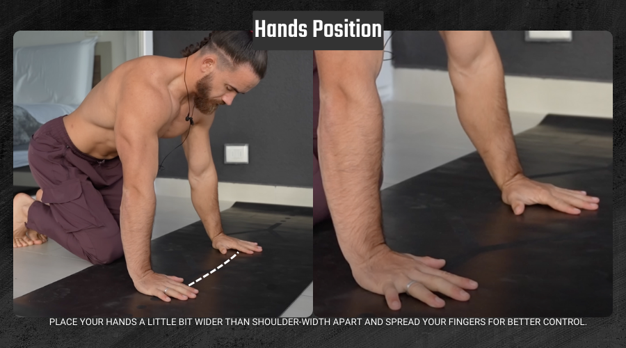 Hands Position: Place your hands a little bit wider than shoulder-width apart and spread your fingers for better control. This is the starting position. Keep your legs bent a little bit.