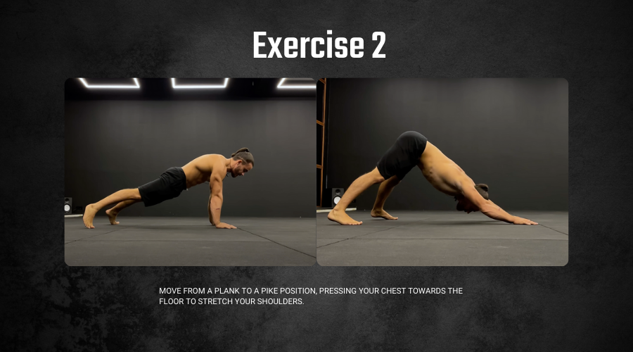 Move from a plank to a pike position, pressing your chest towards the floor to stretch your shoulders.