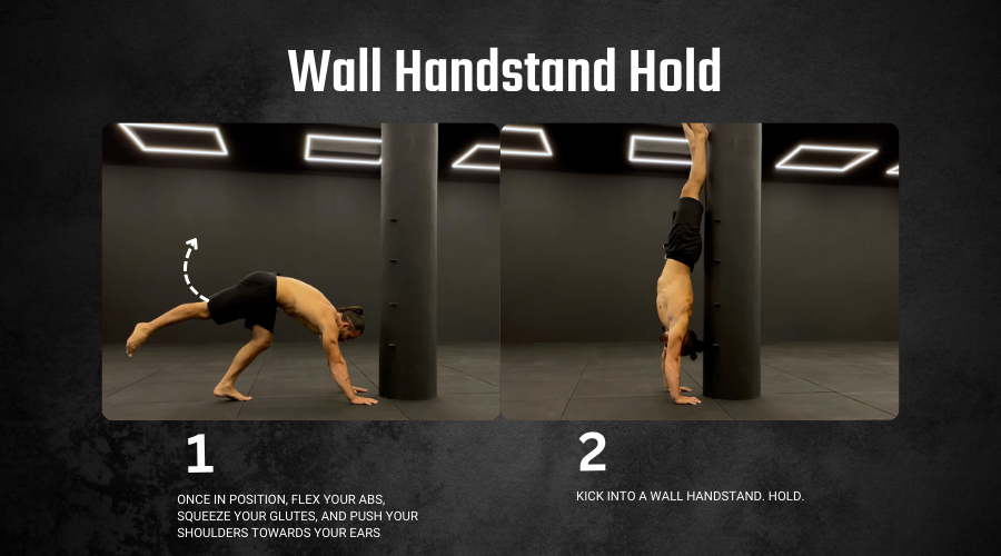 Execution: Once in position, flex your abs, squeeze your glutes, and push your shoulders towards your ears, kick into a wall handstand.