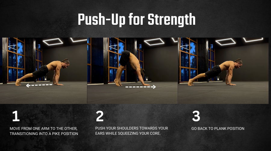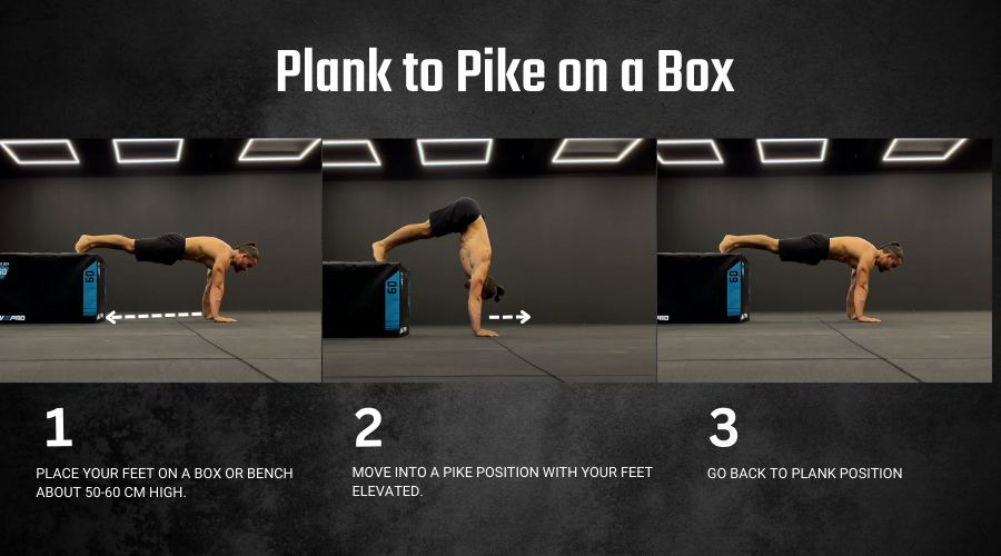 Execution: Move from one arm to the other, transitioning into a pike position. Push your shoulders towards your ears while squeezing your core.