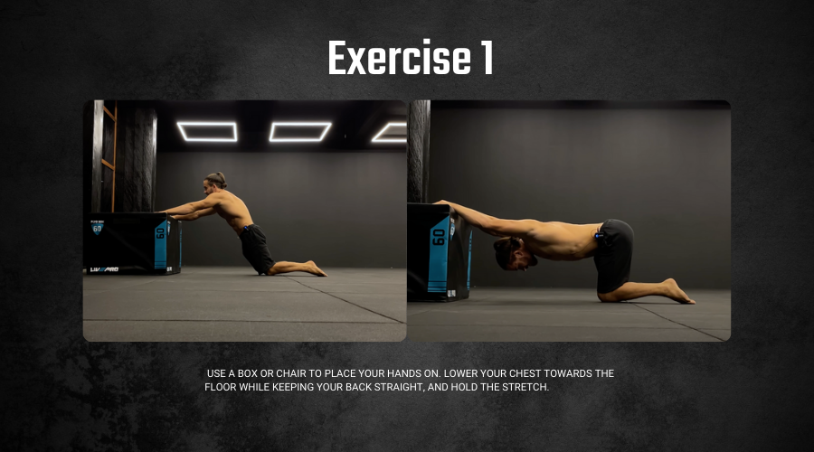 Use a box or chair to place your hands on. Lower your chest towards the floor while keeping your back straight, and hold the stretch.