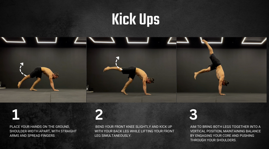 Execution: Place your hands on the ground, shoulder-width apart, with straight arms and spread fingers. Bend your front knee slightly and kick up with your back leg while lifting your front leg simultaneously. Aim to bring both legs together into a vertical position, maintaining balance by engaging your core and pushing through your shoulders.
