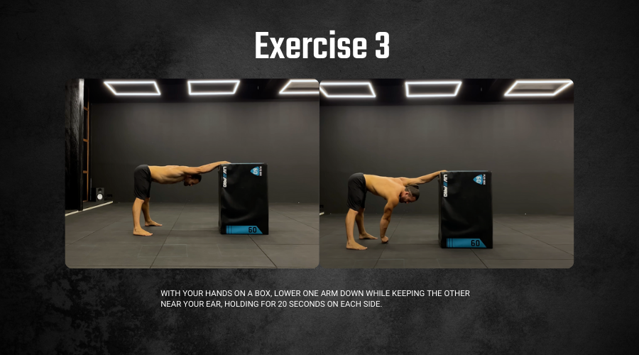 With your hands on a box, lower one arm down while keeping the other near your ear, holding for 20 seconds on each side.