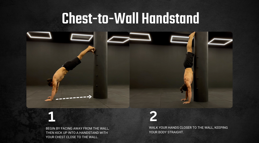 Starting Position: Begin by facing away from the wall, then kick up into a handstand with your chest close to the wall.