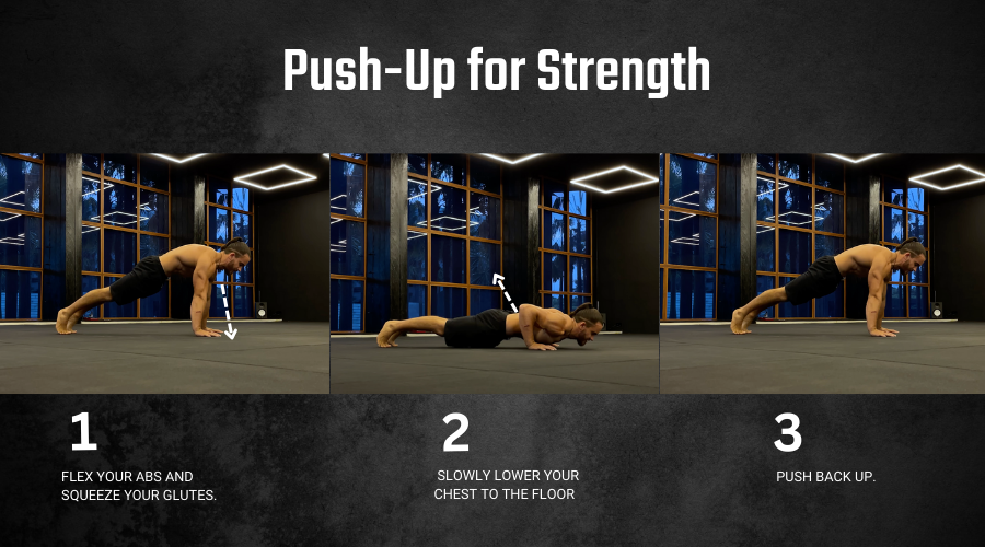 Execution: Flex your abs and squeeze your glutes. Slowly lower your chest to the floor, then push back up.