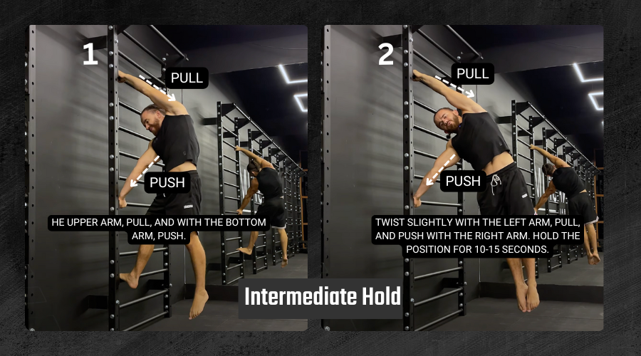 - Movement: Twist slightly with the left arm, pull, and push with the right arm. Hold the position for 10-15 seconds.