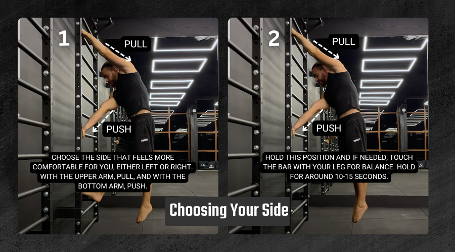 - Positioning: Place your left arm up and right arm down. With the upper arm, pull, and with the bottom arm, push.