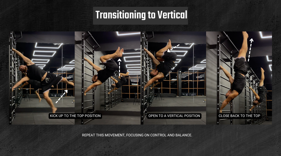 - Kick-Up to Vertical: Kick up to the top position, open to a vertical position, then close back to the top.